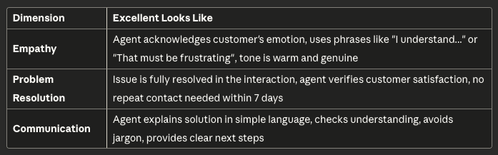 For each priority dimension, describe what "excellent" looks like with specific, observable behaviors.